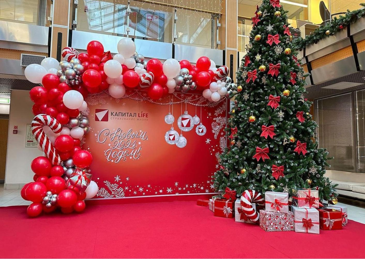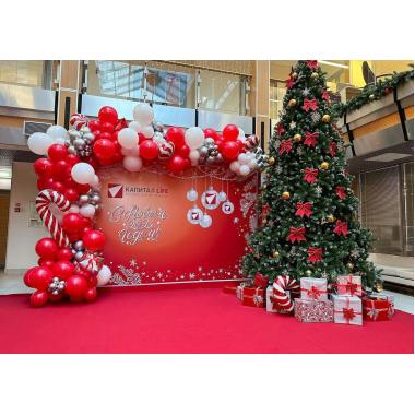 Баннер размер- 3 м высота на 4 м ширина можем заменить фон и надпись добавить  Ваш логотип. Баннер оформленный шарами по левому краю и сверху их цвета тоже можно заменить. Елка в стоимость не входит.