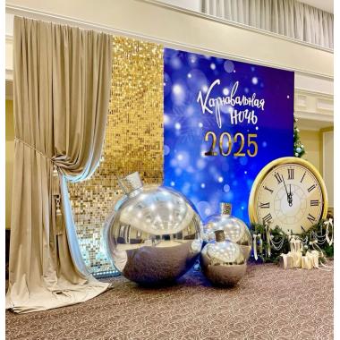 Баннер размером 3м высота на 5м ширина, можем заменить фон и надпись добавить  Ваш логотип.  Мерцающие пайетки золото с драпировкой тканью- аренда, объемная фигура часы декор  хвойными ветками и игрушками аренда.  Большие елочные шары аренда.