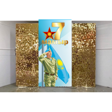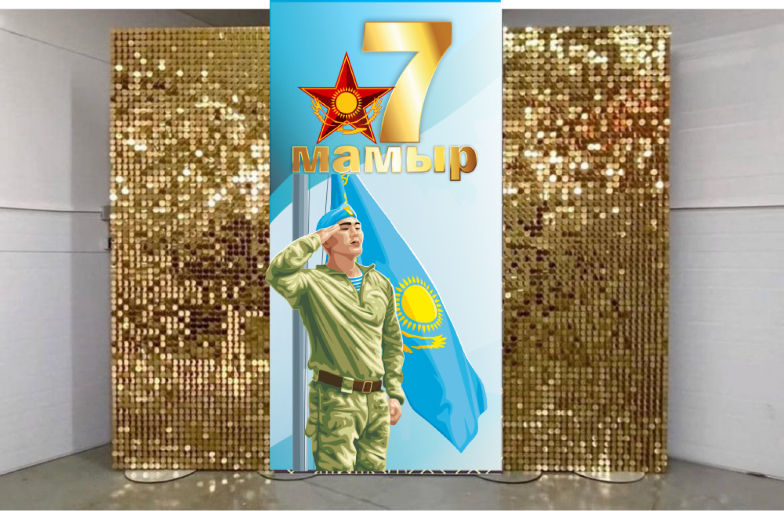 Готовая тематическая фотозона с золотыми пайетками и тематическим изображением на   7 мамыр Отан Қорғаушылар Күні — отлично подойдёт для офиса, школы, детсада, ТЦ или мероприятия.