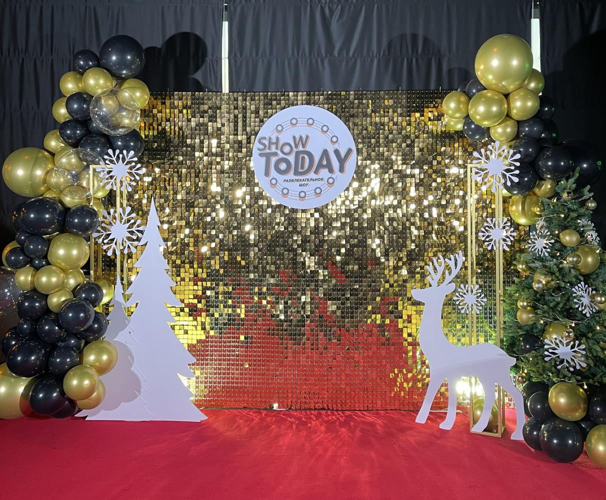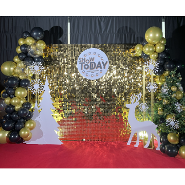 Мерцающие пайетки золото размер 2,3м высота на 3м ширина аренда. Объемная табличка  пвх  Вашей надписью +логотип. Оформленный шарами по обеим сторонам, декор фигуры елки и олень. маленькая елочка 1,5м.